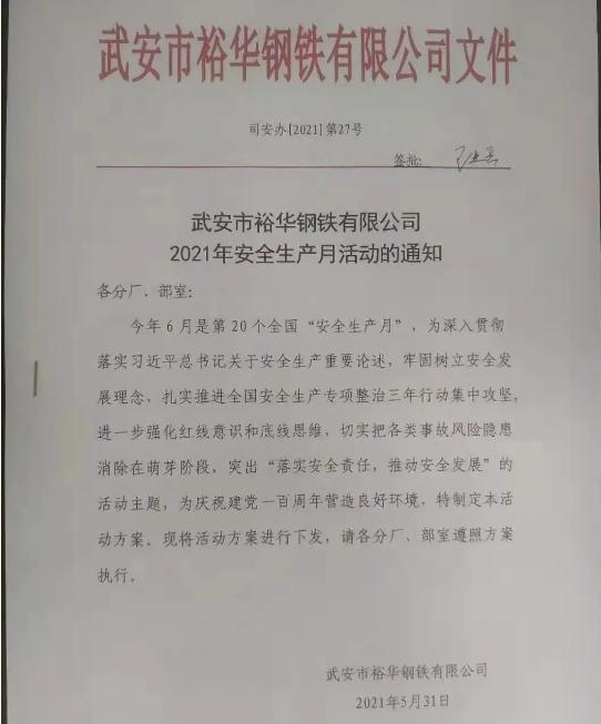 今年6月是第20個全國“安全生產(chǎn)月”,為深入貫徹落實習近平總書記關于安全生產(chǎn)重要論述,牢固樹立安全發(fā)展理念,扎實推進安全生產(chǎn)專項整治三年行動集中攻堅,進一步強化紅線意識和底線思維,切實把各類事故風險隱患消除在萌芽階段,突出“落實安全責任,推動安全發(fā)展”的活動主題,全力維護安全生產(chǎn)形勢持續(xù)穩(wěn)定,為慶祝建黨百年營造良好環(huán)境,6月1日,裕華鋼鐵“2021年安全月啟動大會”在公司能源三樓會議室召開。